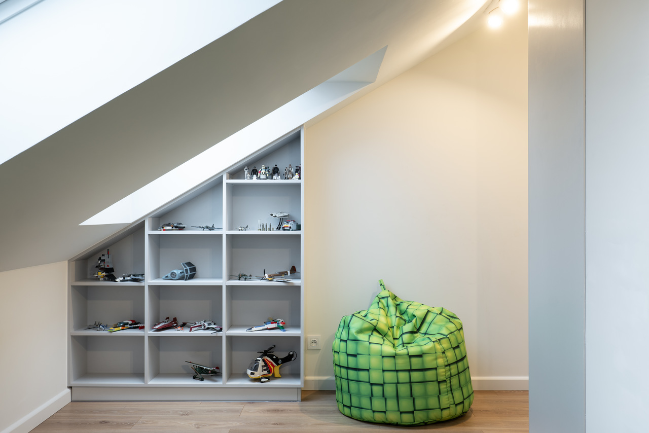 Nasze zadanie: Projekt wielobranżowy przebudowy i zmiany sposobu użytkowania poddasza z uwzględnieniem zmian parteru budynku jednorodzinnego wraz z projektem wnętrz. Zadanie obejmowało projekt nowopowstałych 3 pokoi dzieci i łazienki na poddaszu, klatki schodowej oraz aranżacji salonu, sypialni, gabinetu oraz pokoju gościnnego pełniącego funkcję drugiego gabinetu.
