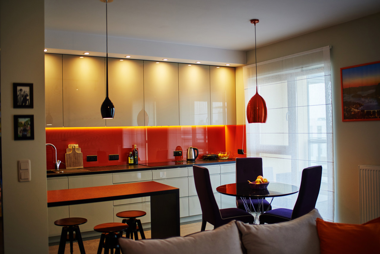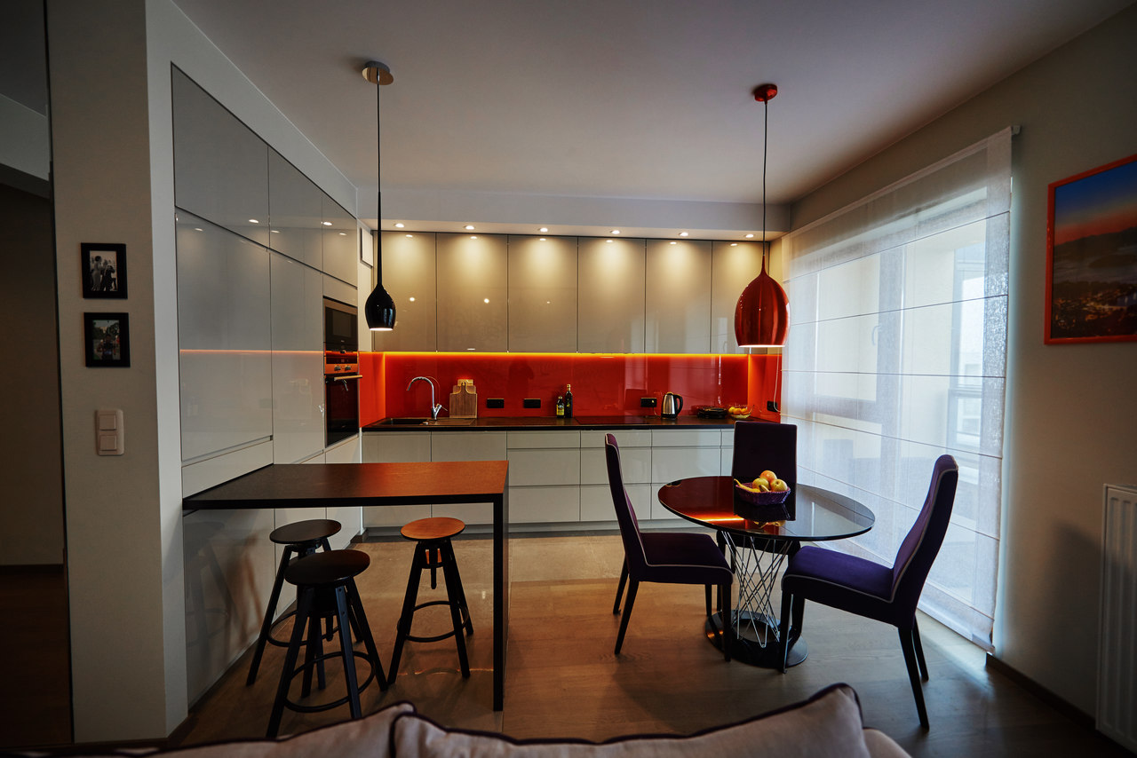 Nasze zadanie: Stworzenie azylu, a zarazem miejsca do przyjmowania gości dla młodego, dynamicznego mężczyzny. Współpraca obejmowała projekt salonu, kuchni, sypialni z zabudową szaf, łazienki głównej, toalety, schowka oraz mebli na wymiar.