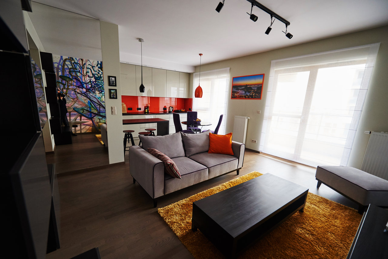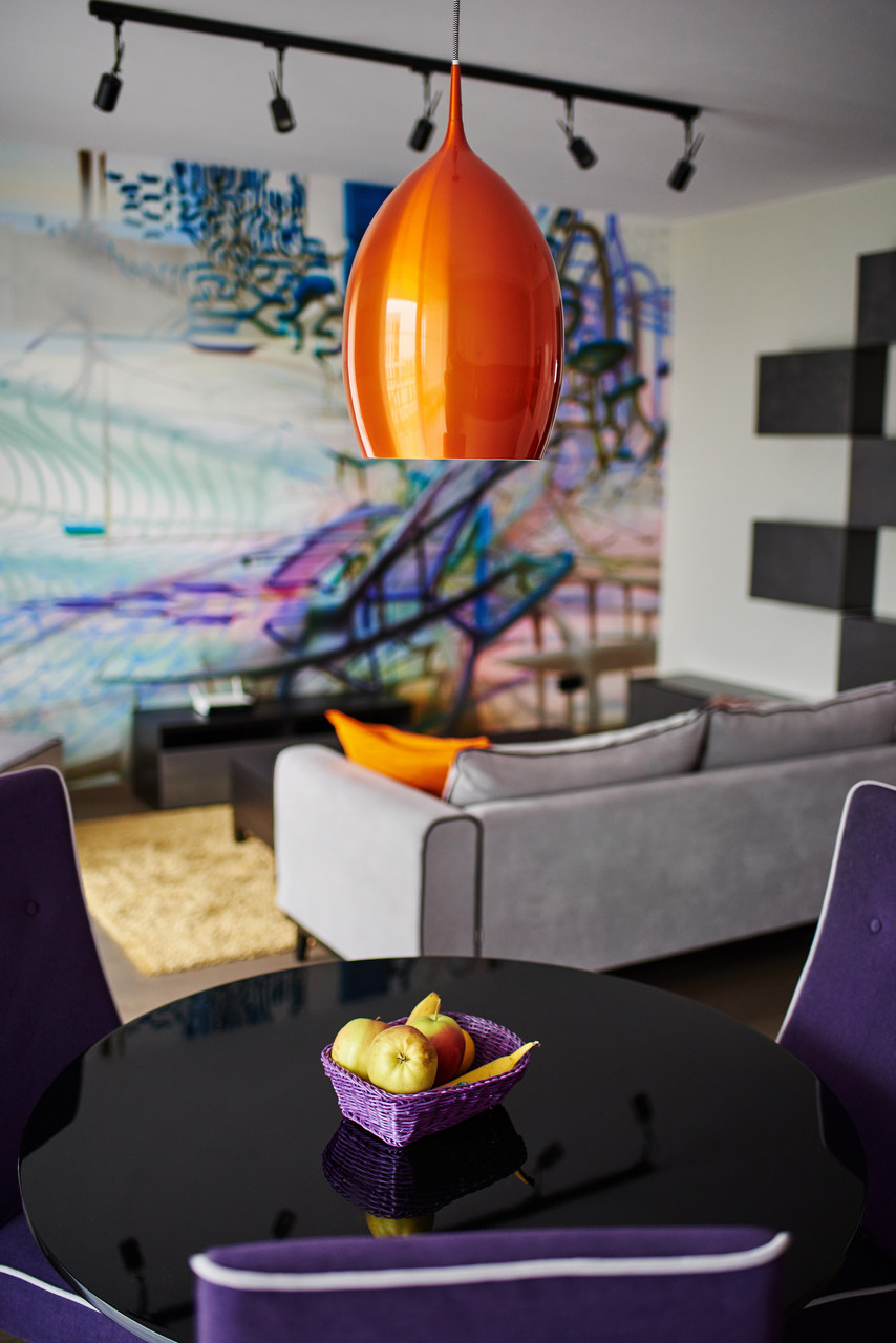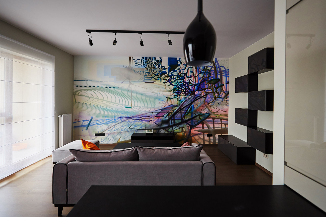 Zastosowane rozwiązanie: Zdecydowaliśmy się na stworzenie otwartej przestrzeni poprzez połączenie kuchni, jadalni oraz salonu, dodając także mocne akcenty kolorystyczne. Aby dostosować charakter przestrzeni do charakteru właściciela, na jednej ze ścian salonu został namalowany odważny i designerski mural. W sypialni, gdzie zaprojektowaliśmy szafę/garderobę z ukrytym miejscem na TV, postawiliśmy na stonowane kolory.