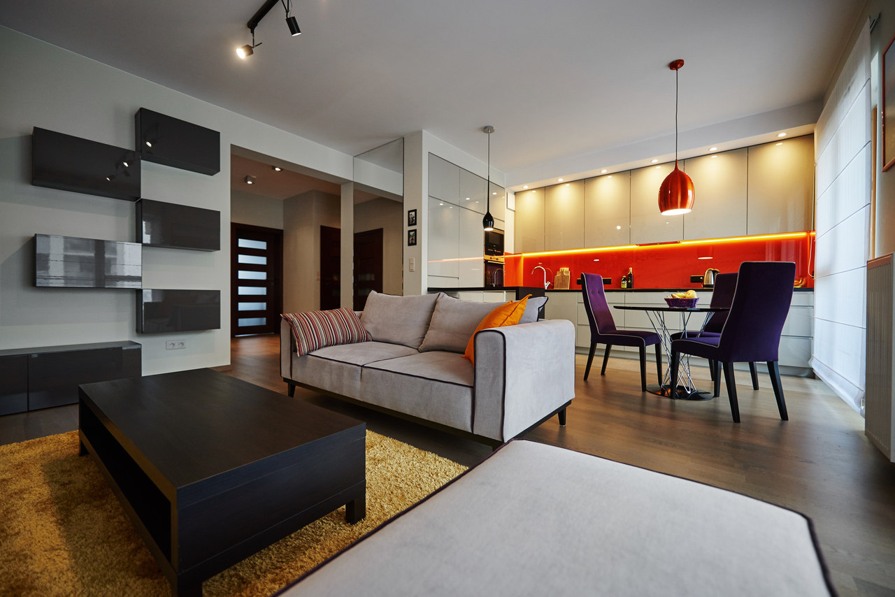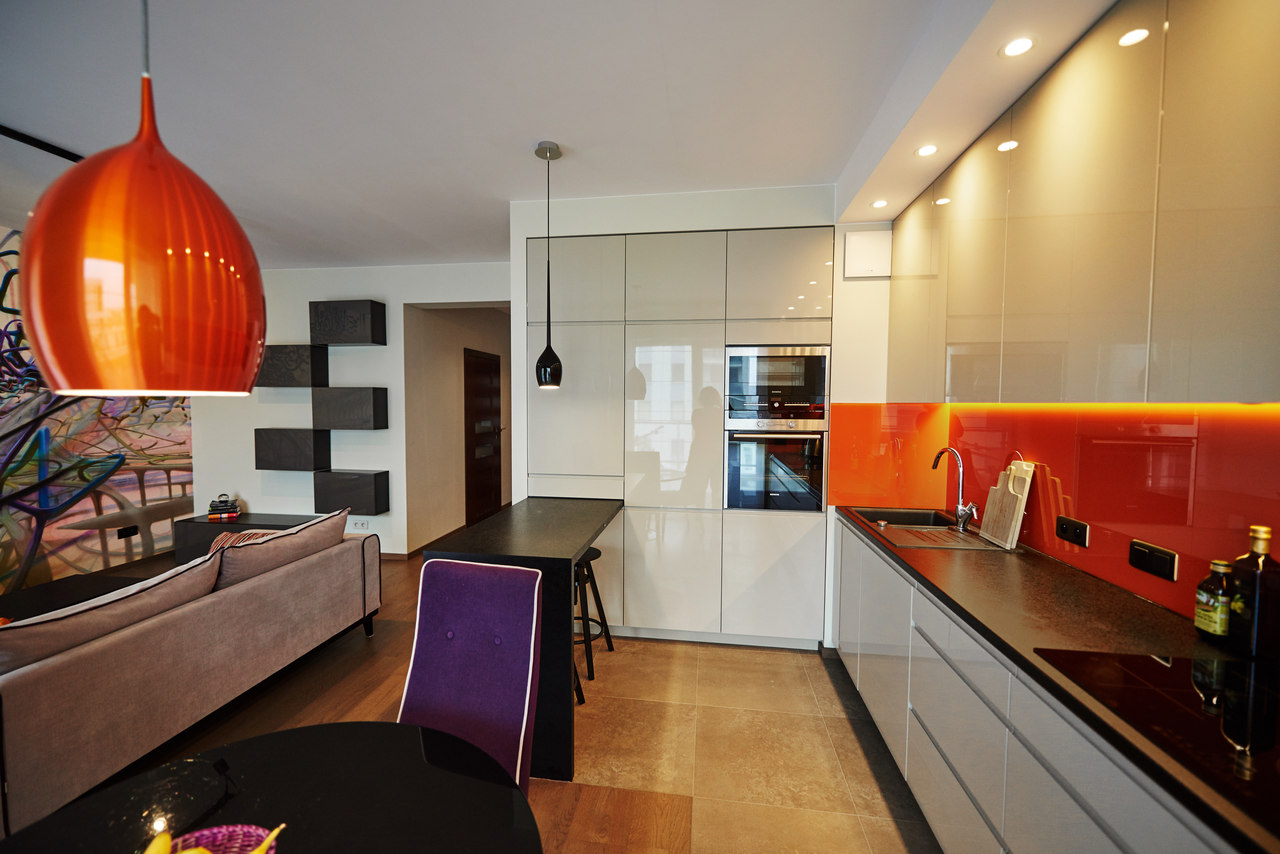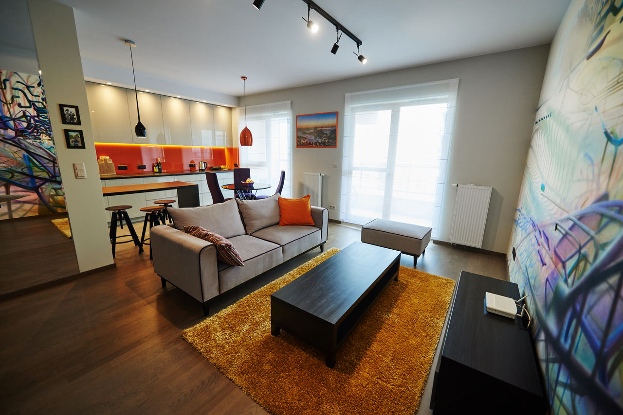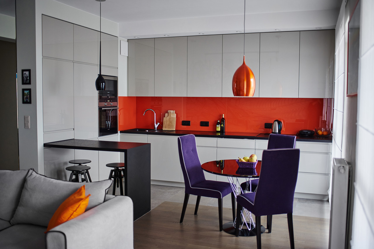 Zastosowane rozwiązanie: Zdecydowaliśmy się na stworzenie otwartej przestrzeni poprzez połączenie kuchni, jadalni oraz salonu, dodając także mocne akcenty kolorystyczne. Aby dostosować charakter przestrzeni do charakteru właściciela, na jednej ze ścian salonu został namalowany odważny i designerski mural. W sypialni, gdzie zaprojektowaliśmy szafę/garderobę z ukrytym miejscem na TV, postawiliśmy na stonowane kolory.