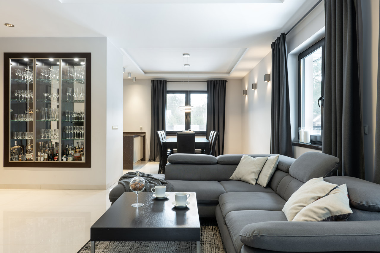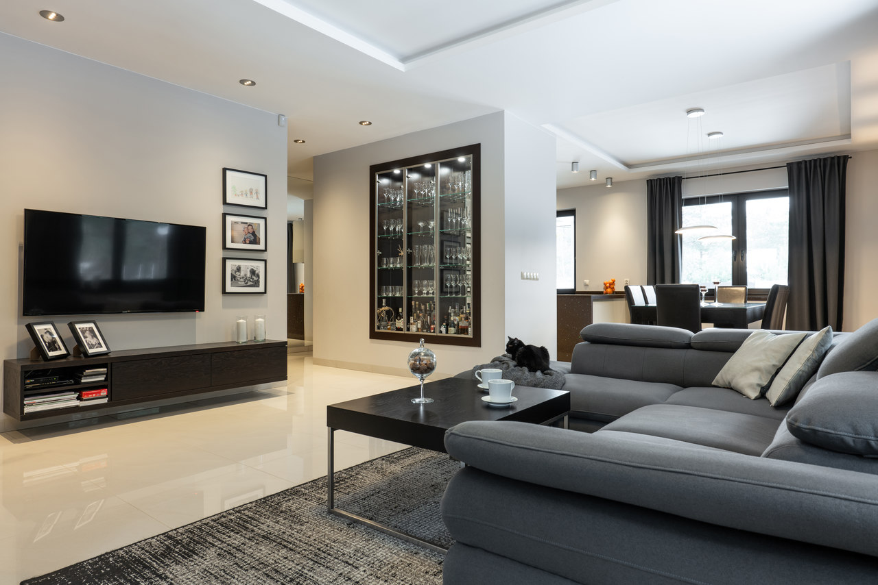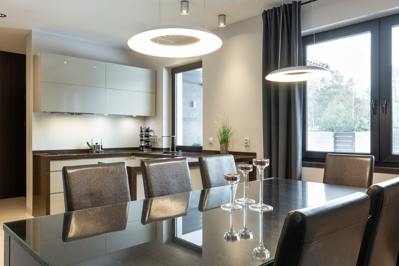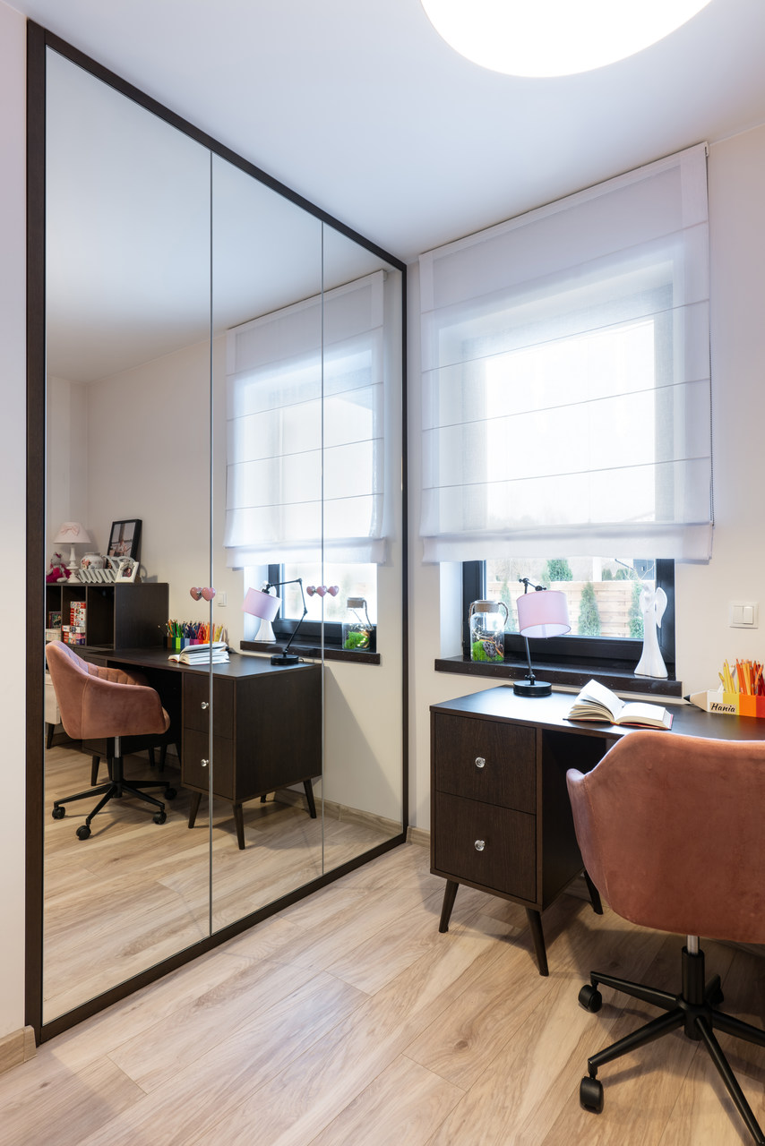 Nasze zadanie: Projekt układu funkcjonalnego domu oraz projekt powstałych wnętrz w nowoczesnym, eleganckim stylu z elementami ciemnego drewna. Zadanie obejmowało projekt salonu, kuchni z jadalnią, sypialni, pokoi dzieci, gabinetu, łazienki i toalety oraz mebli na wymiar.