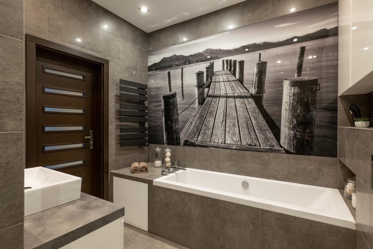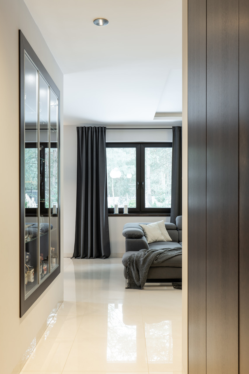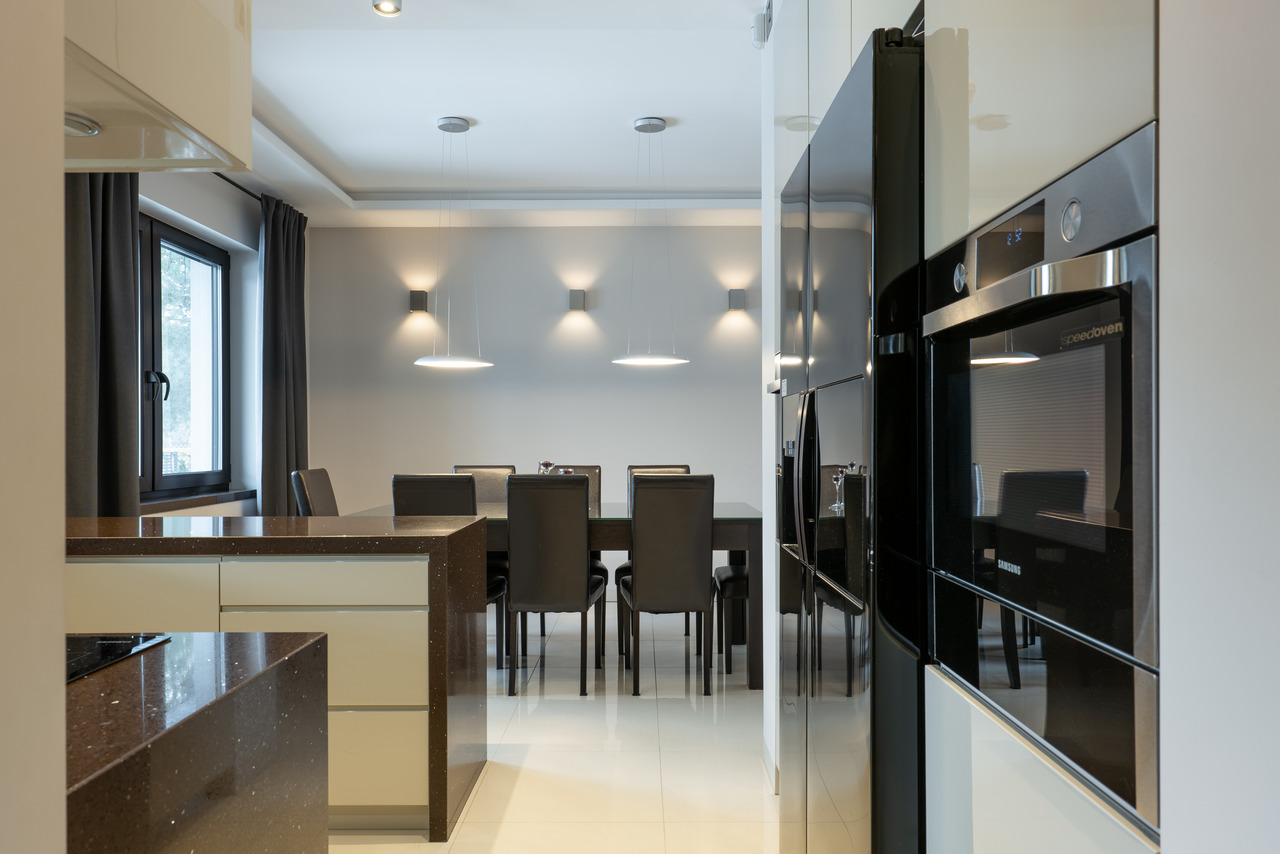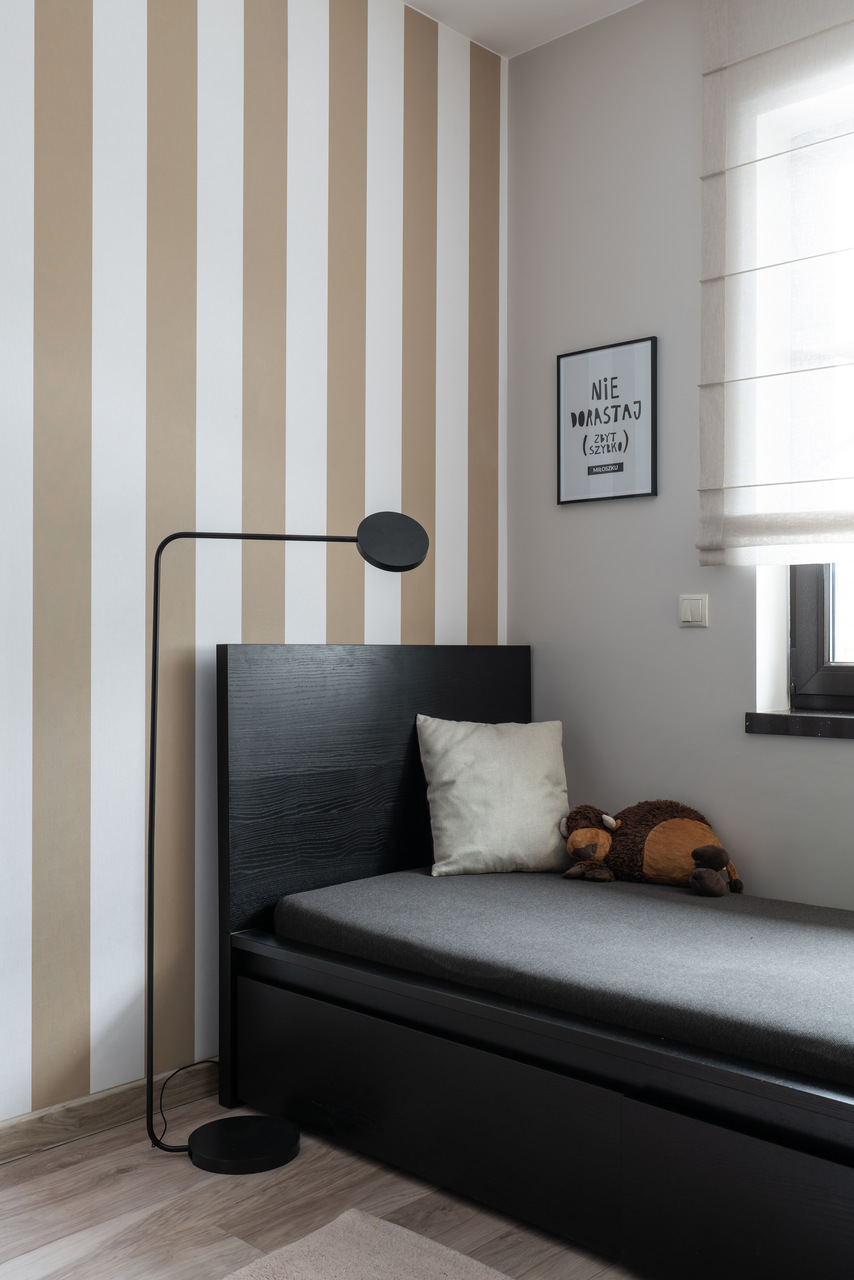 Zastosowane rozwiązanie: W tej realizacji wizualne wydzieliliśmy kuchnię otwierając ją jedynie na jadalnię z dużym rozkładanym stołem. Praktyczna przegroda z wysoką zabudową kuchenną oraz dużą lodówką z jednej strony stanowi też element ozdobny od strony przestronnego salonu w formie szklanej witryny. W części dziennej na posadzce położono jasny gres, natomiast w pokojach prywatnych panele podłogowe. W łazience rodzinnej znajduje się zarówno wanna jak i duży prysznic z ukrytymi półkami na kosmetyki. Wszystkie zaprojektowane wnętrza są stonowane, z ciemnymi akcentami kolorystycznymi w postaci mebli, stolarki drzwiowej i okiennej oraz dodatków.